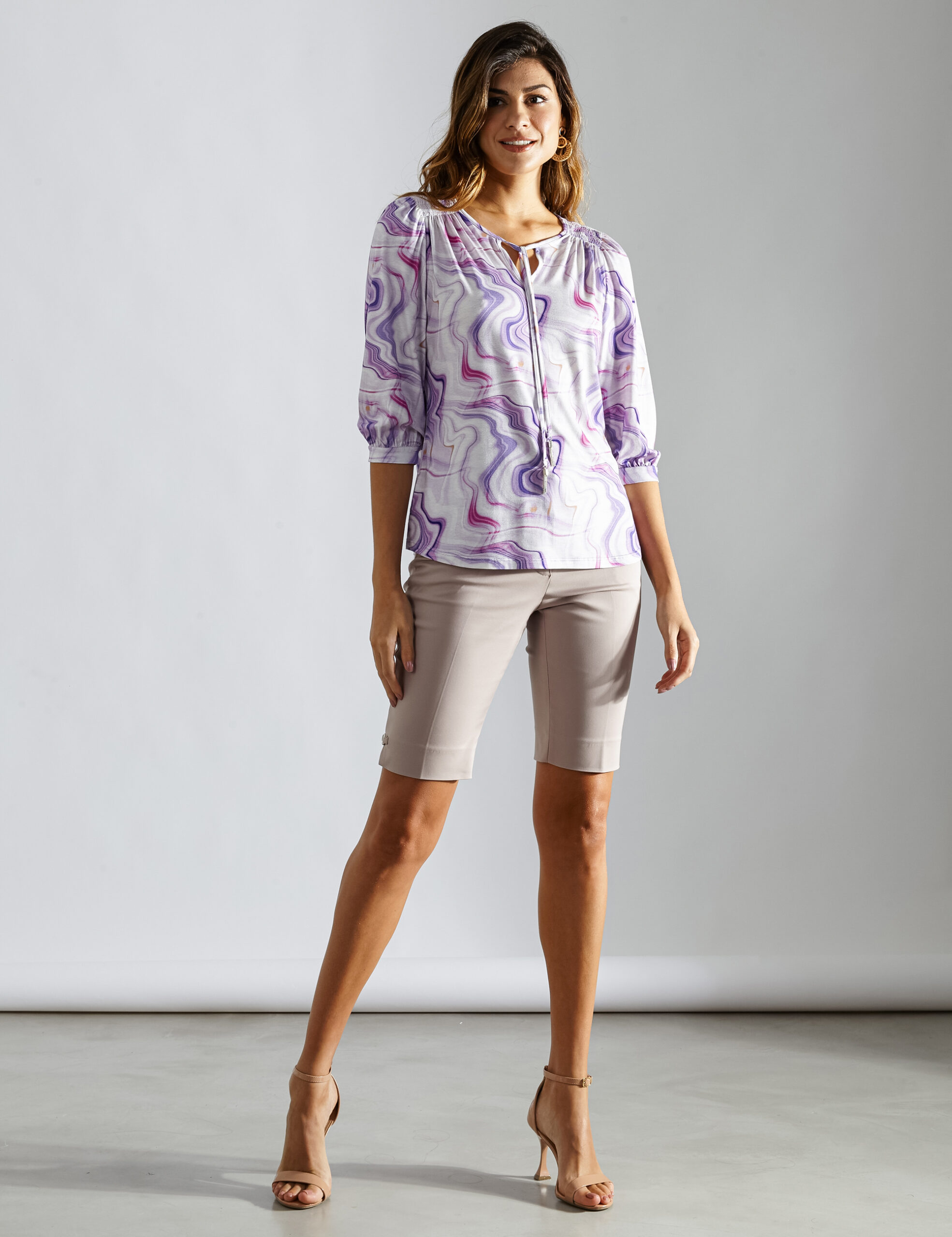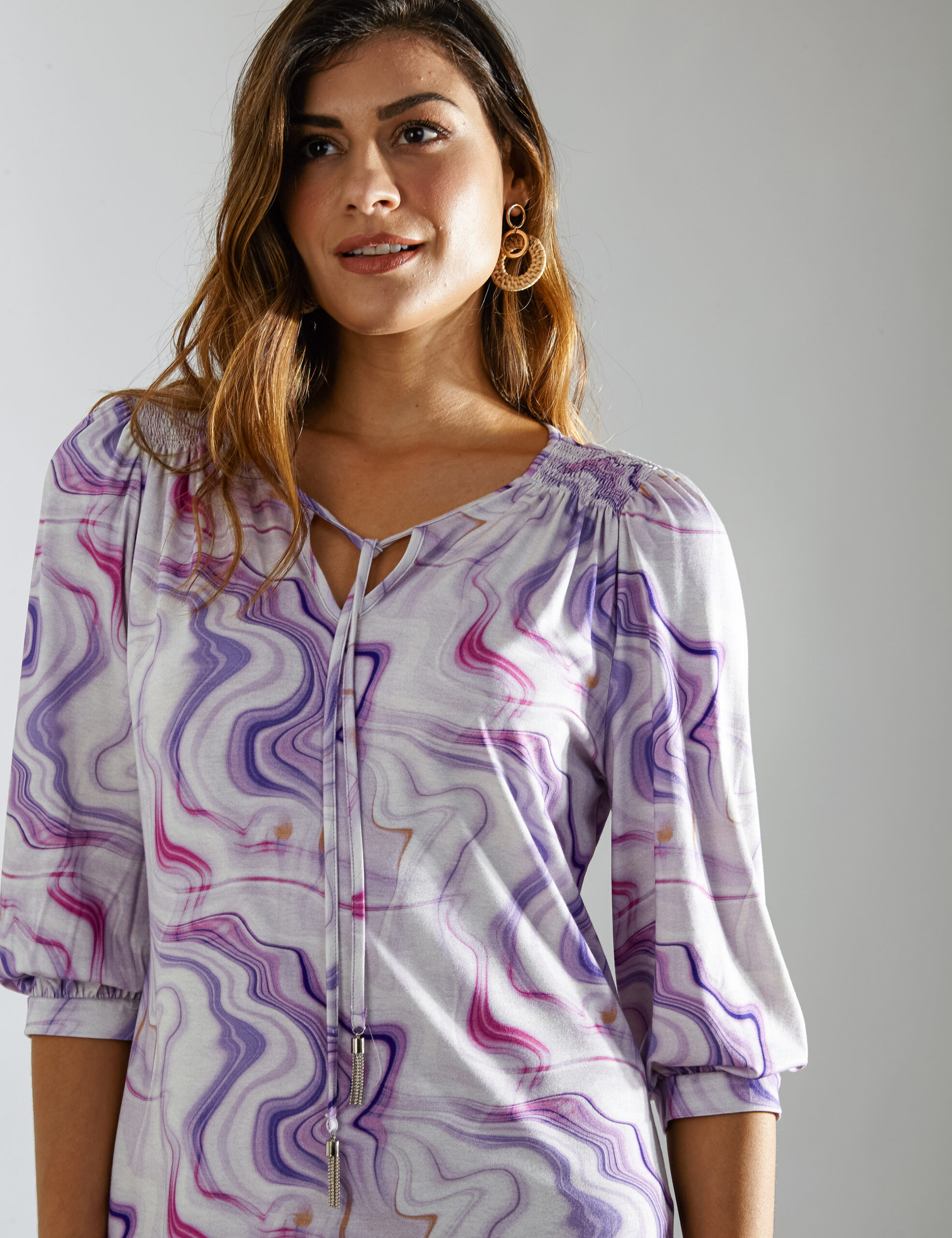 Blusa estampada mix de cores, ombros c/ lastex, gola com recorte v e amarração c/ aviamento chuva, manga 3/4 c/ leve franzido no punho