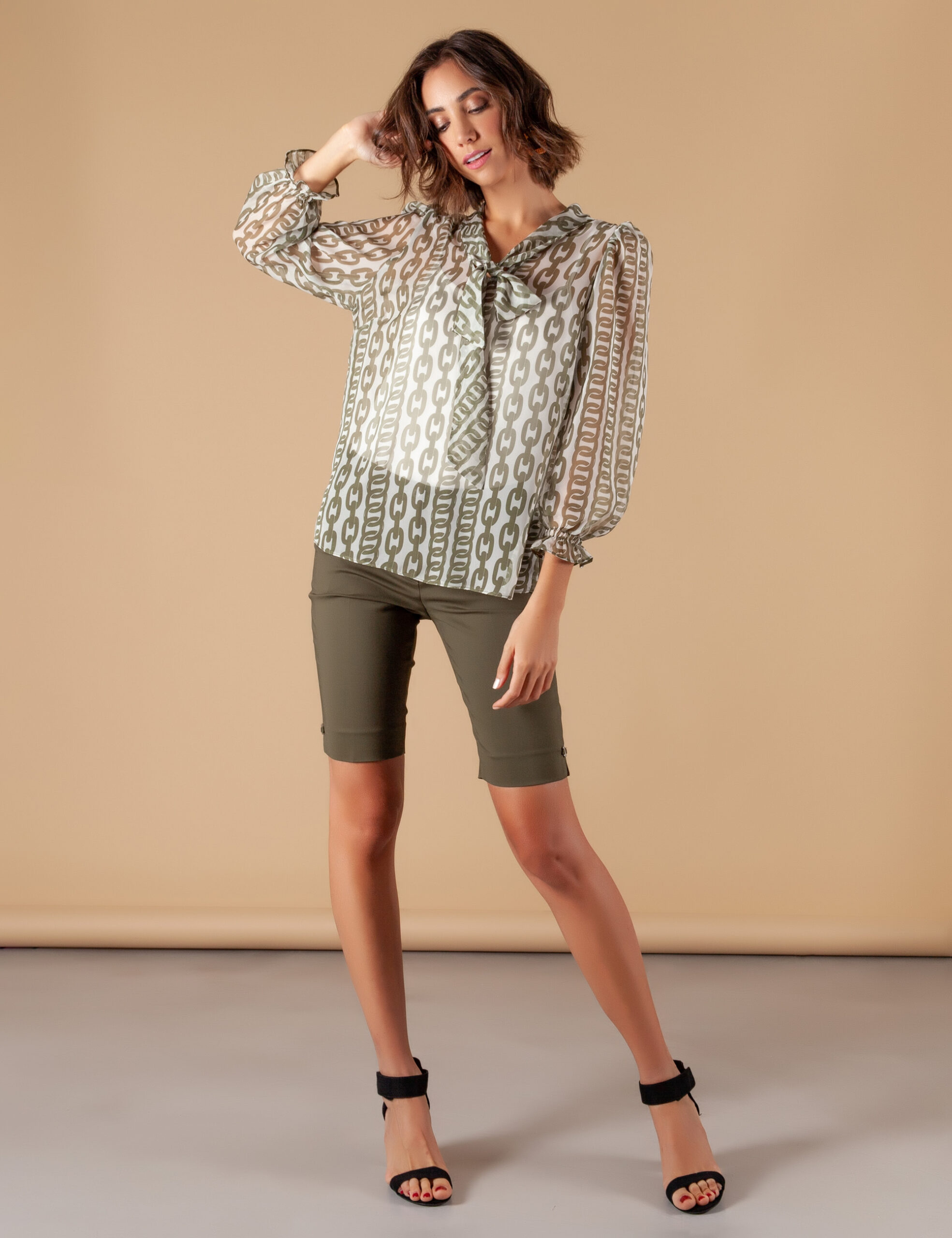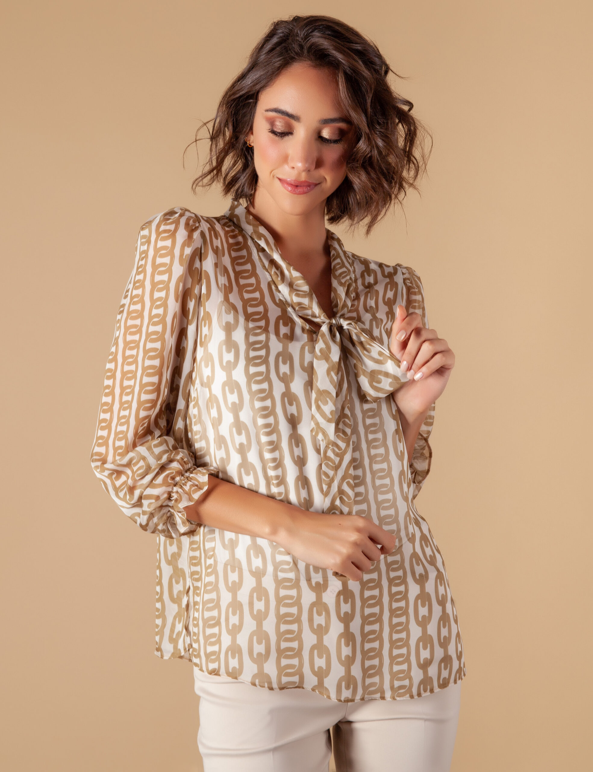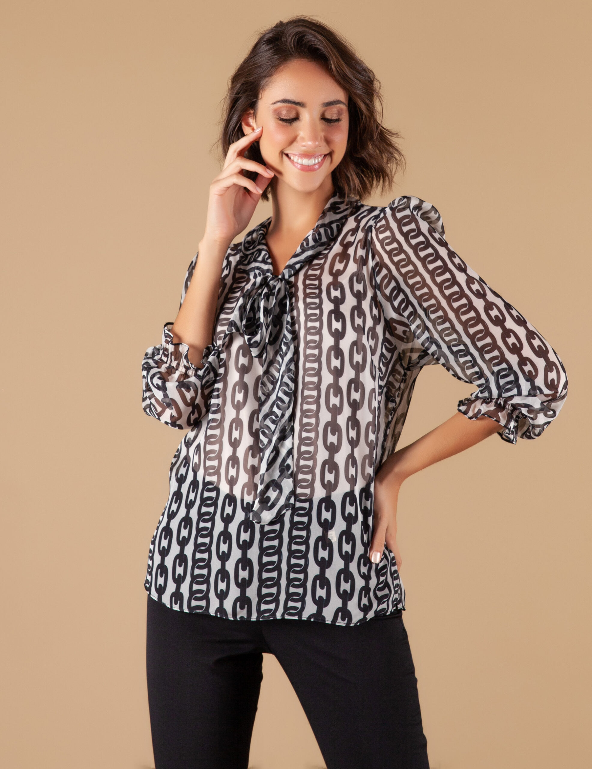 Blusa estampada correntes manga longa, franzido no punho, gola fita para amarração