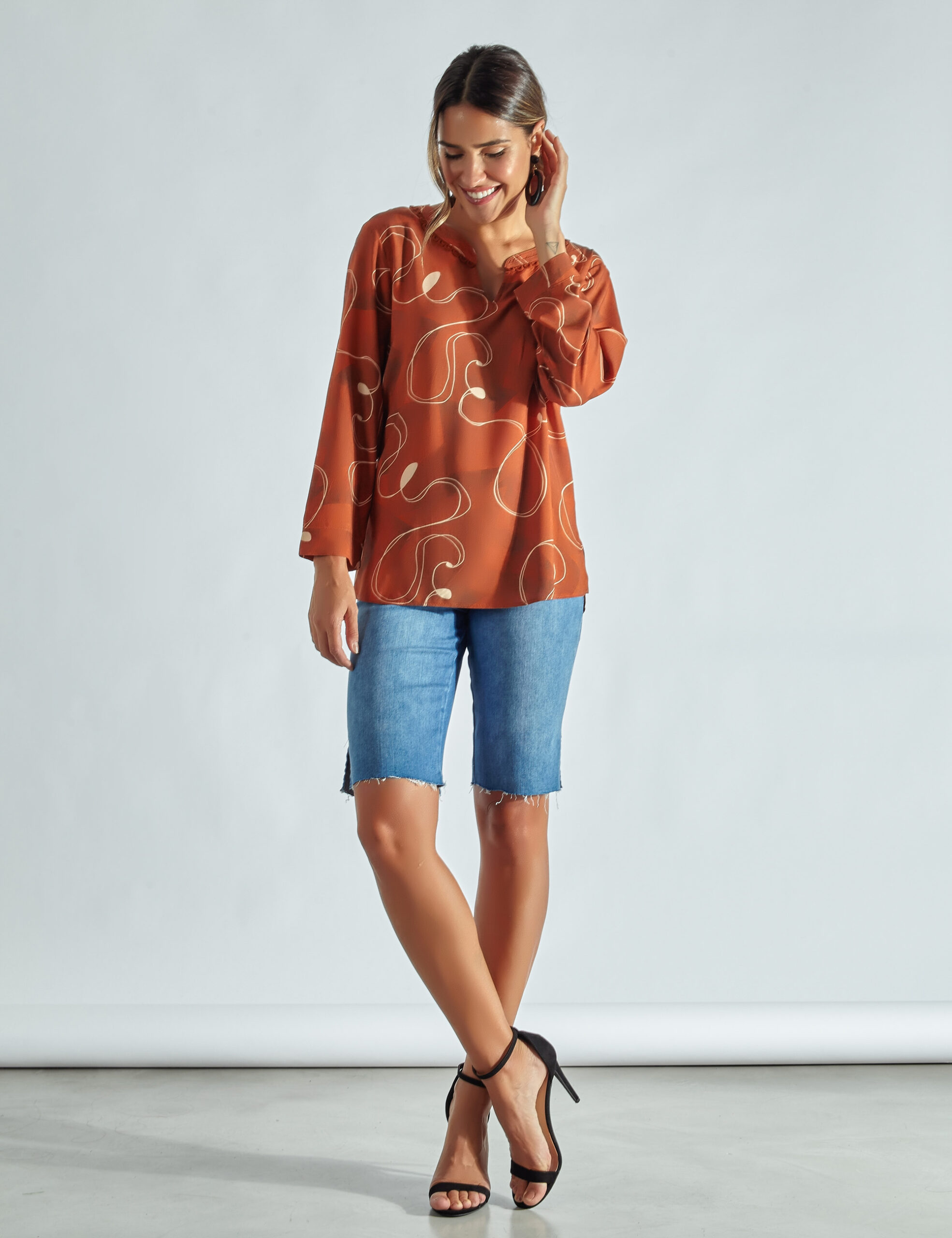 Blusa estampa orgânica confeccionada em viscose, gola redonda com detalhe, manga 3/4