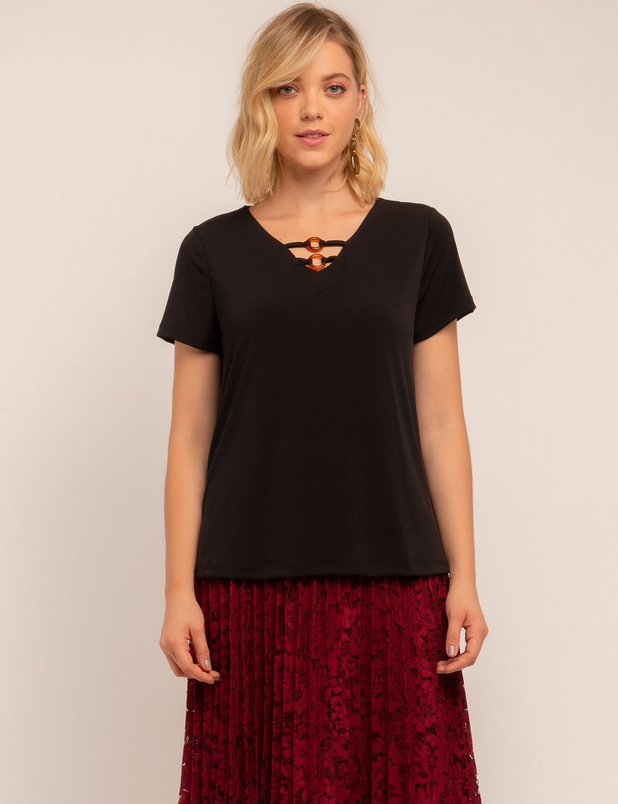 BLUSA MALHA BÁSICA GOLA V COM ARGOLAS.