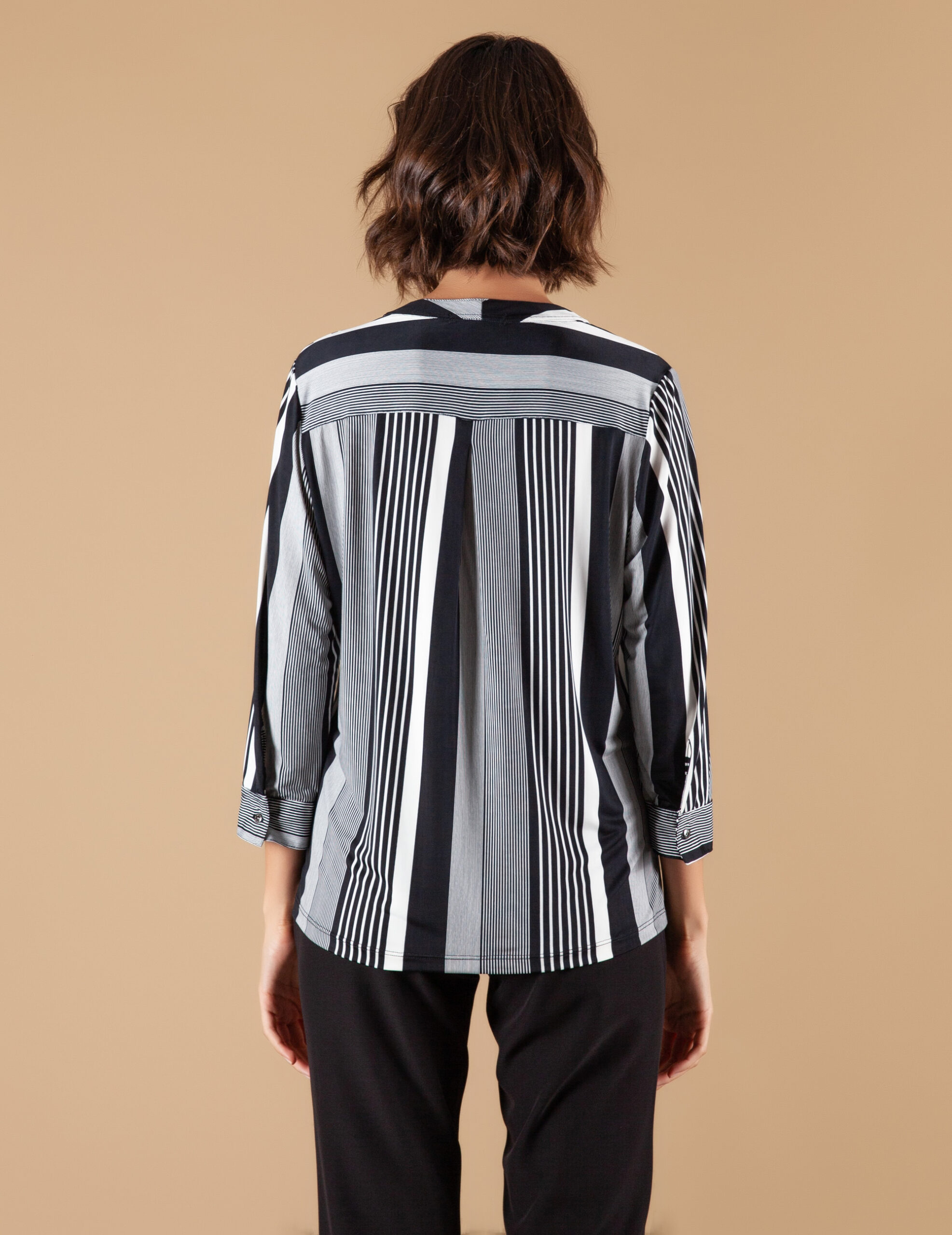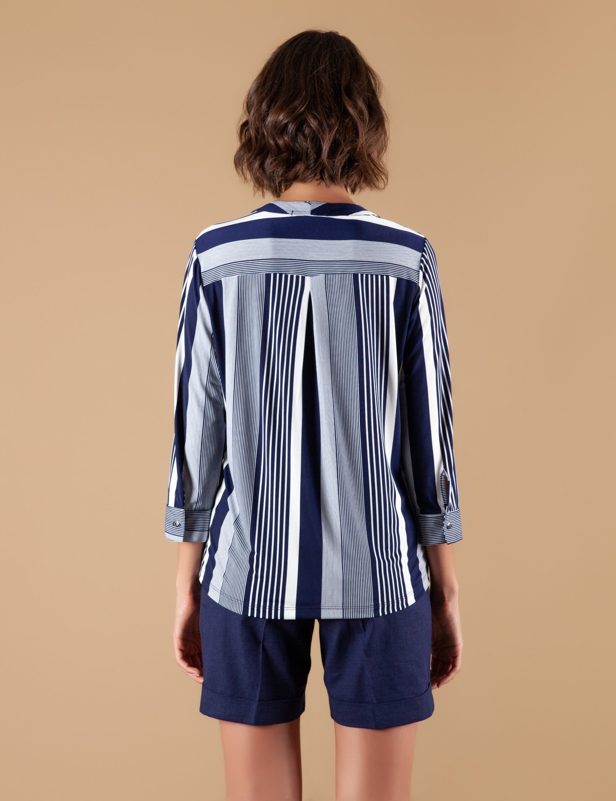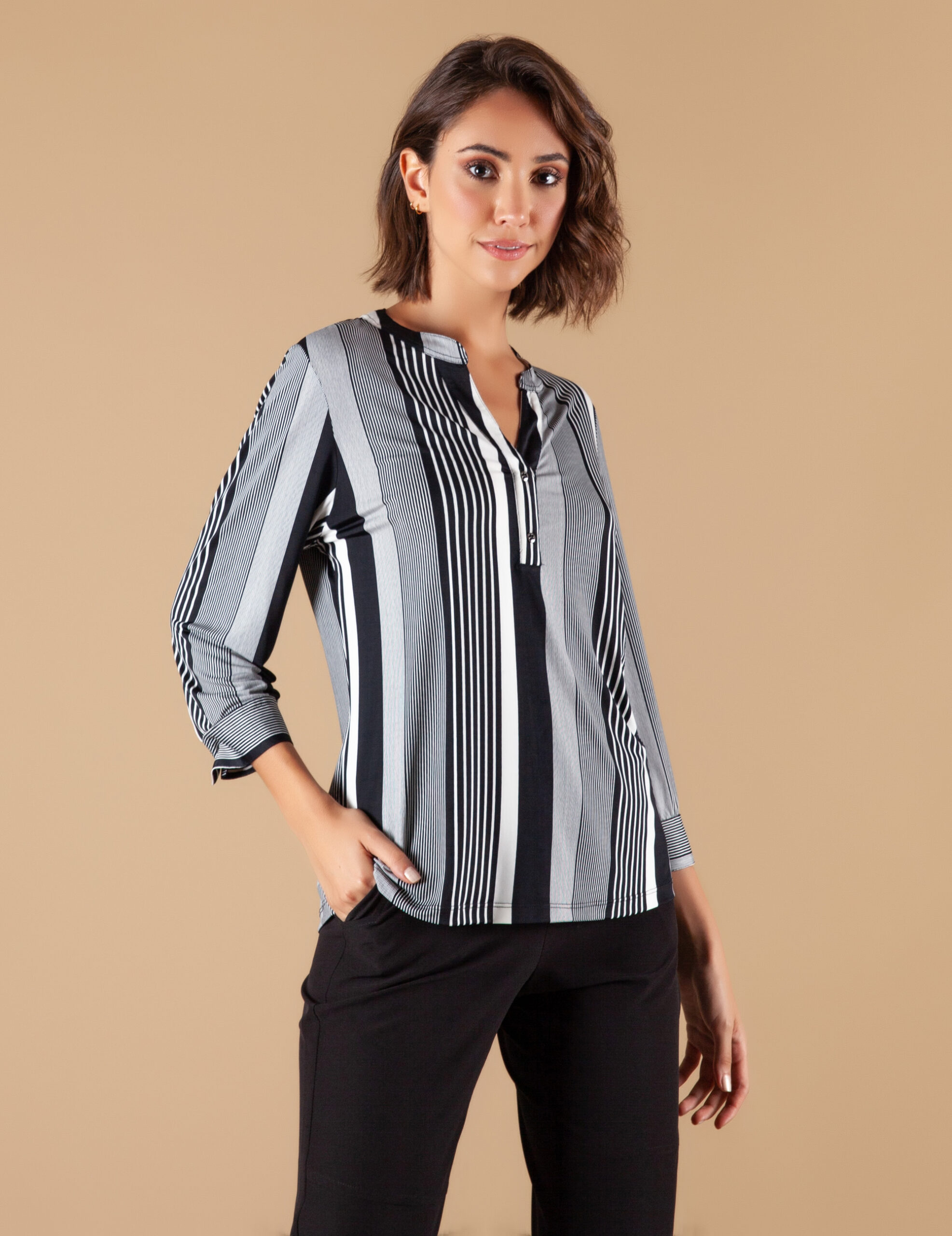 Blusa Malha Fria Listrada gola V c/ botões, manga 3/4