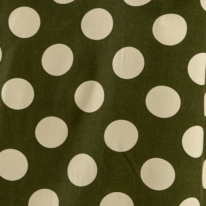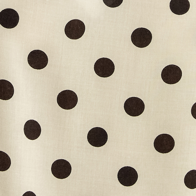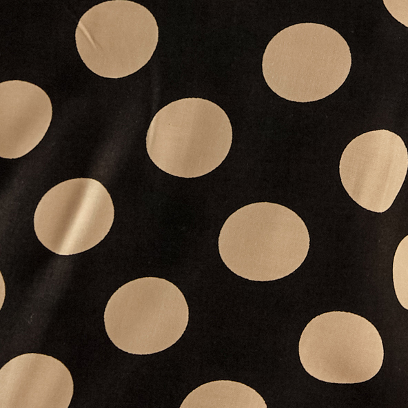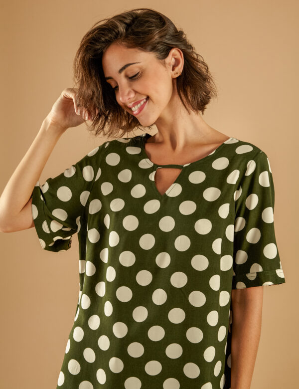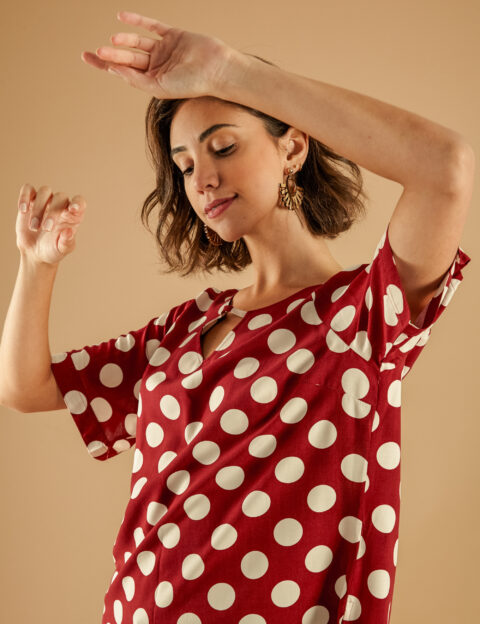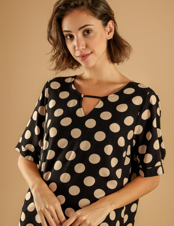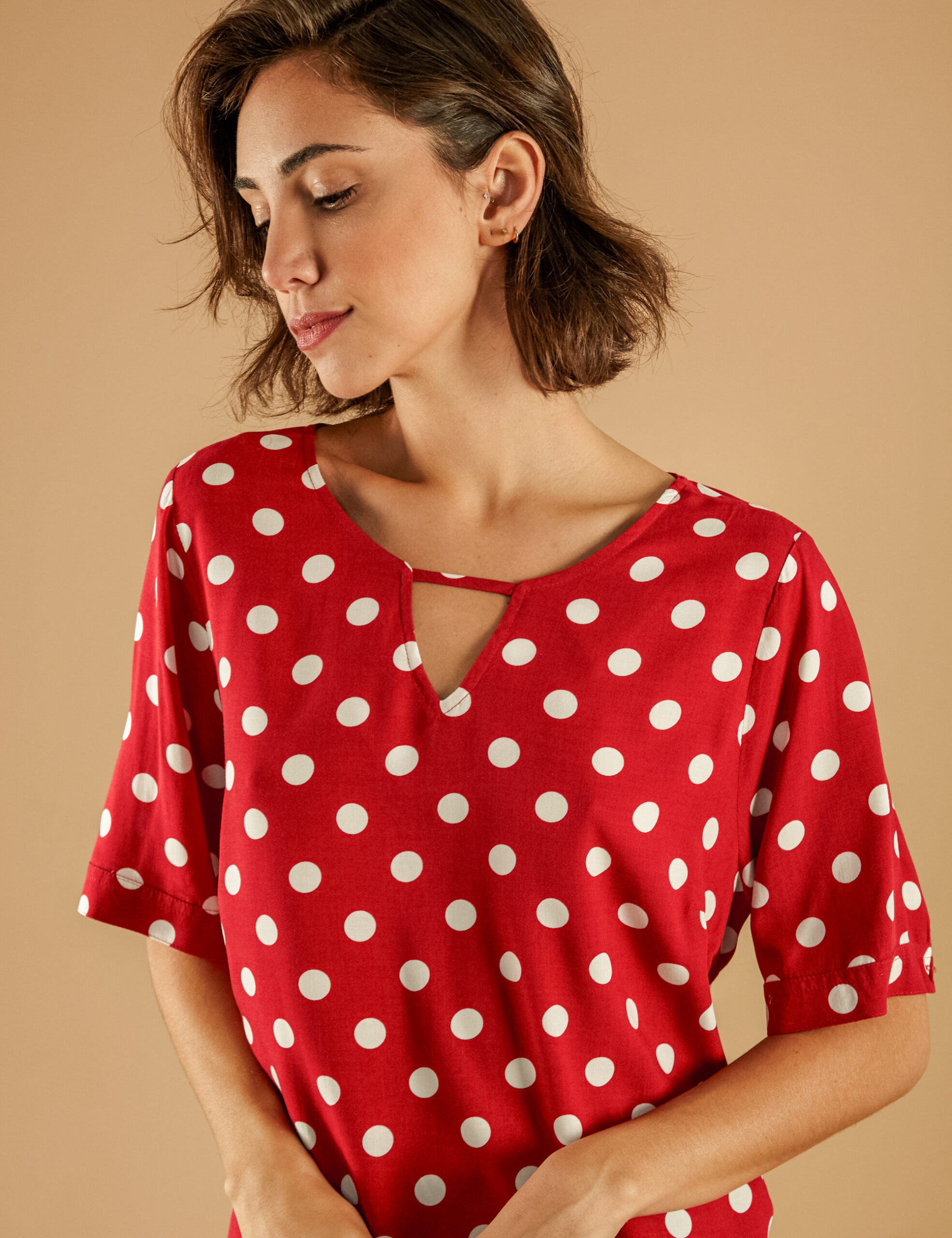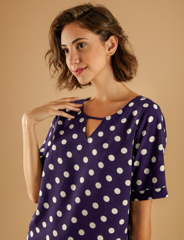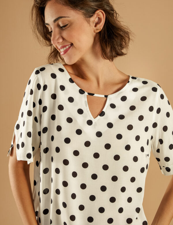 Blusa tecido plano poá recorte em V na gola, três botões nas costas para fecho