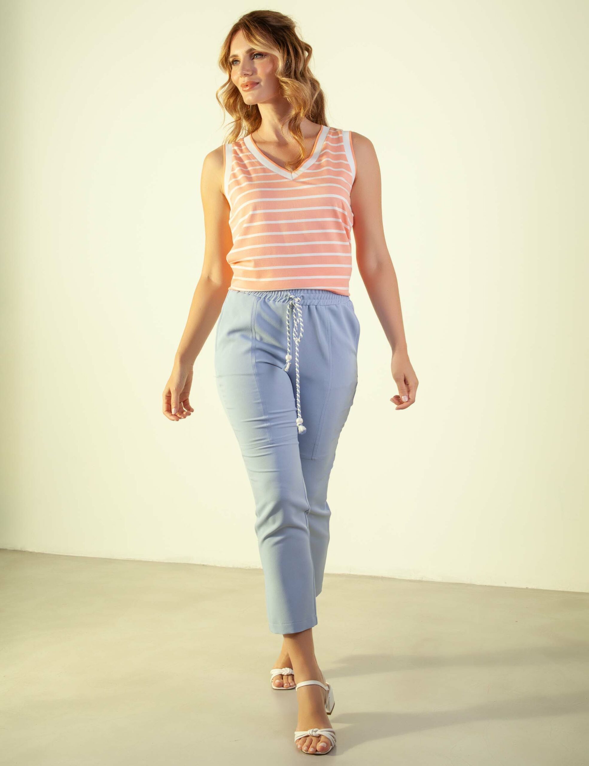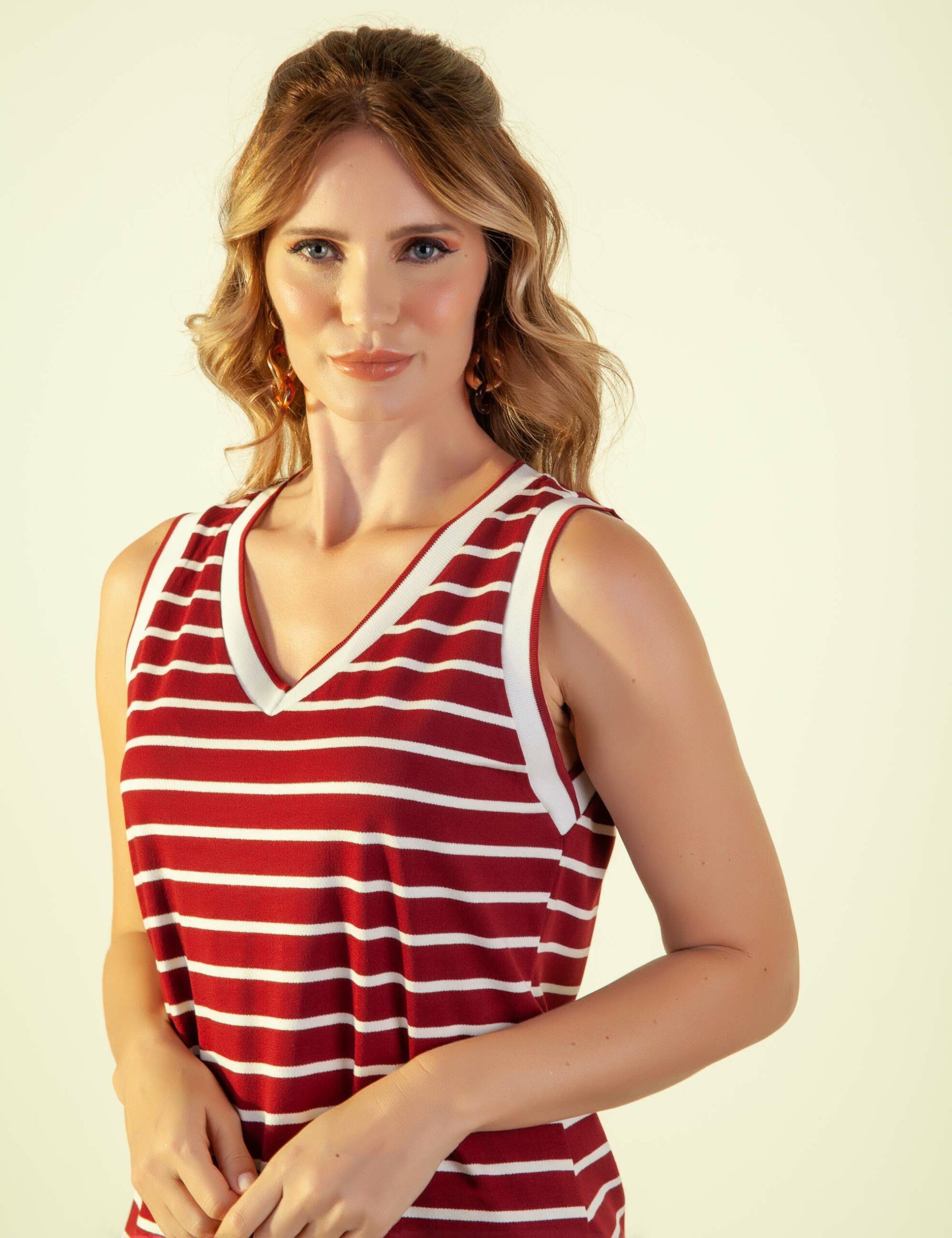Regata confeccionada em malha listrada, gola V com retilínea branco e color