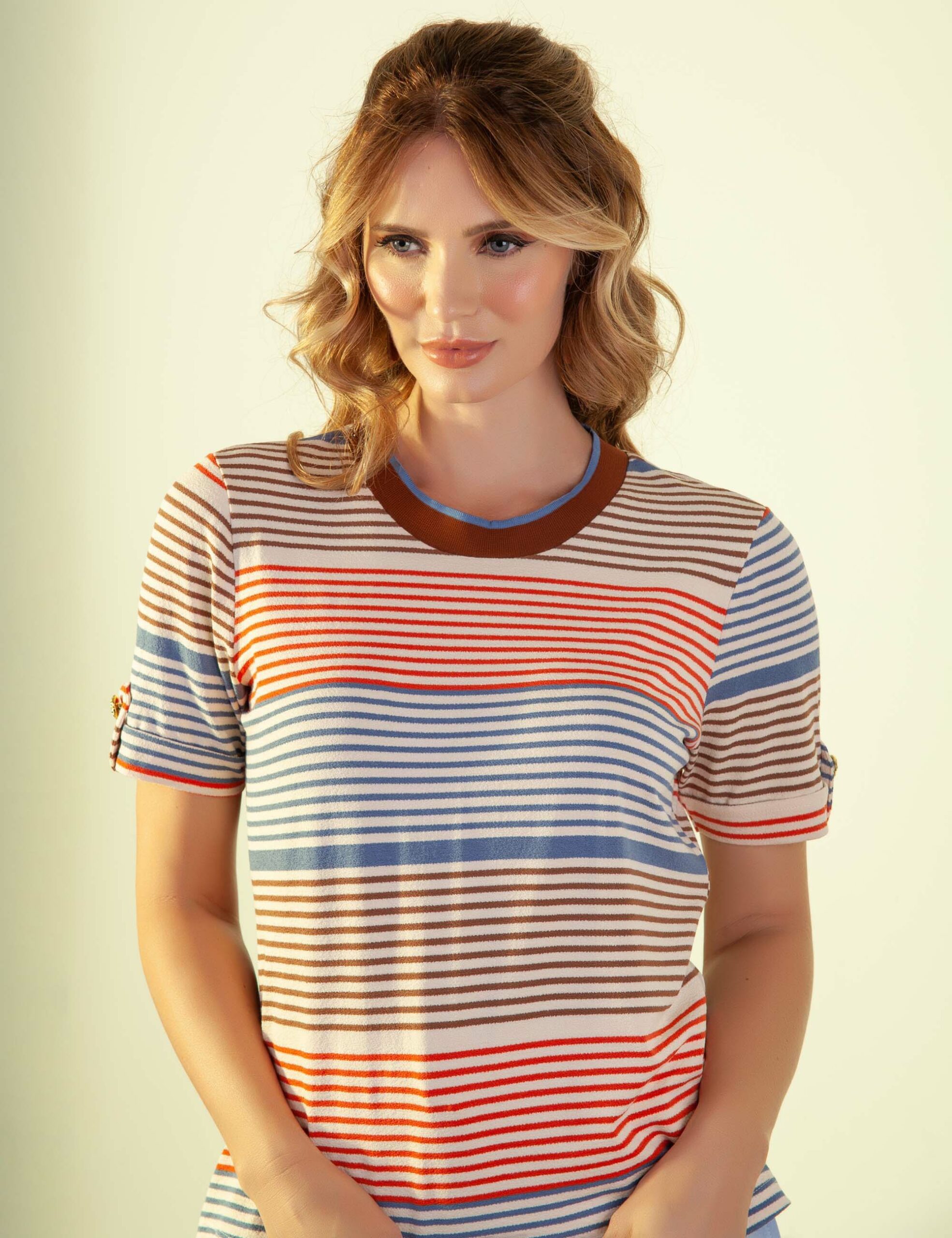 T-shirt Malha Listrada Gola c/ Retilínea Det Botão Manga
