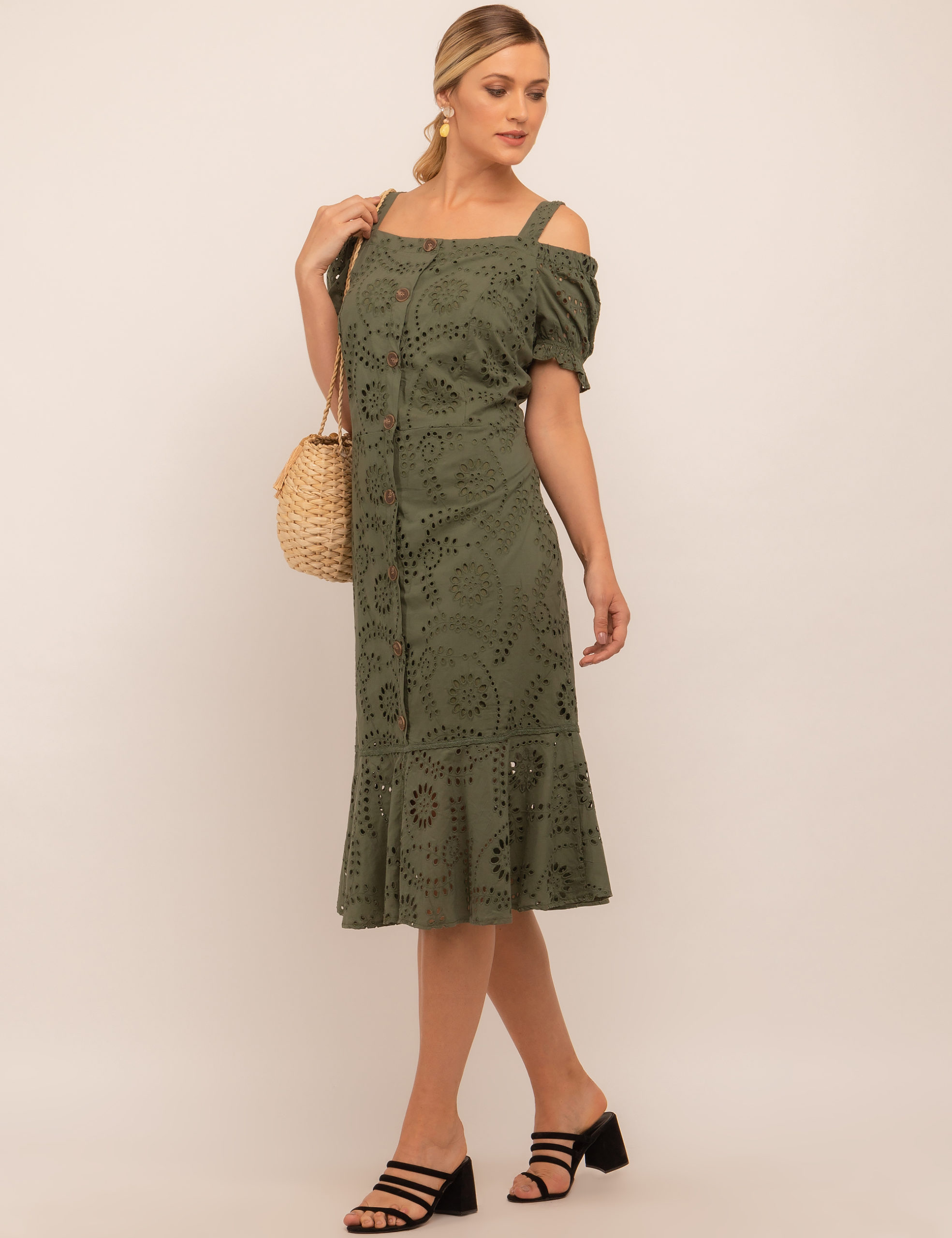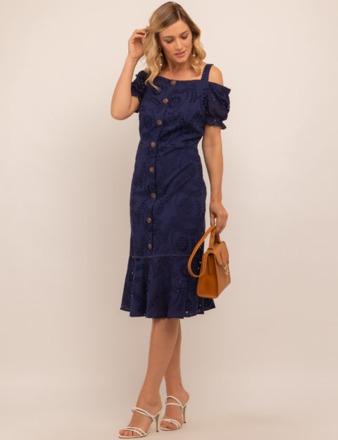 Vestido midi, tecido laise, manga bufante com elástico, alças e botões